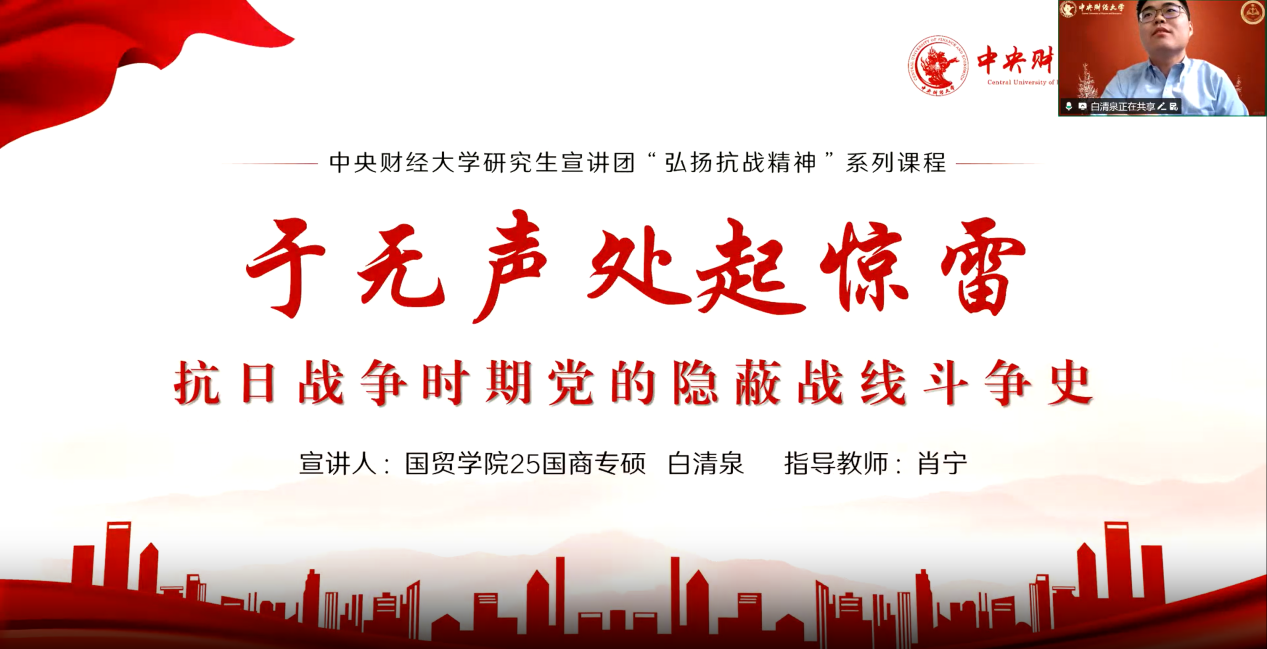 为深入学习党的隐蔽战线斗争史,传承无名英雄的赤胆忠诚,汲取新征程上的奋进力量,2026年2月13日,国际经济与贸易学院中澳项目第三本科生党支部于线上开展了“传承隐蔽战线精神,汲取奋进前行力量”主题党日活动。本次活动特邀学校研究生宣讲团成员白清泉作专题授课,支部全体师生党员参与学习。