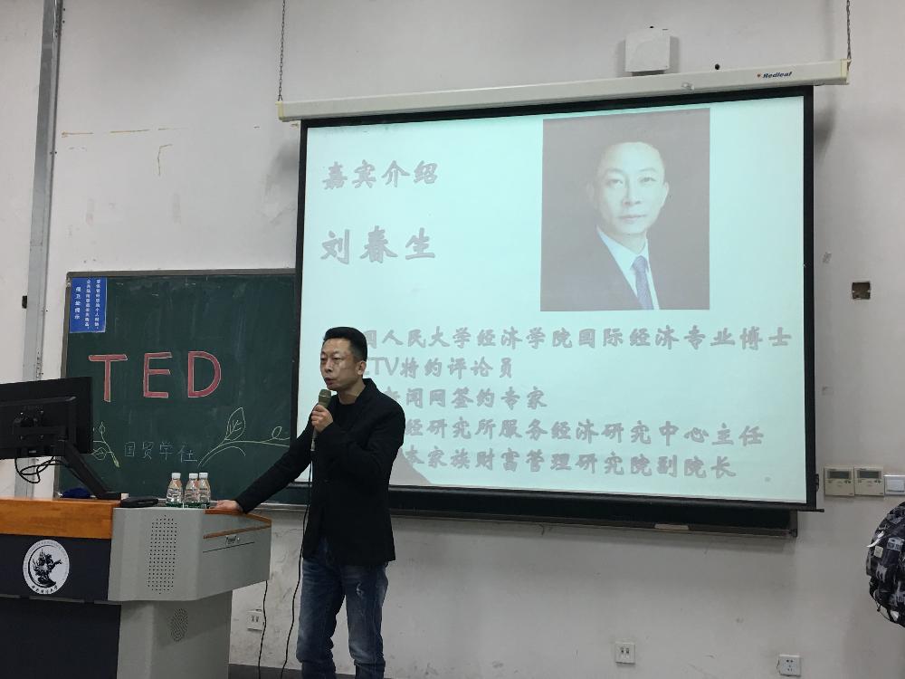 2017年12月4日星期一晚上六点半,由中央财经大学国贸学社主办的“TED”讲座准时开始。国贸学社有幸邀请到了中国人民大学经济学博士、CCTV特约评论员、我校国贸学院副教授刘春生做“中国对外开放的新格局”为主题的TED讲座。
