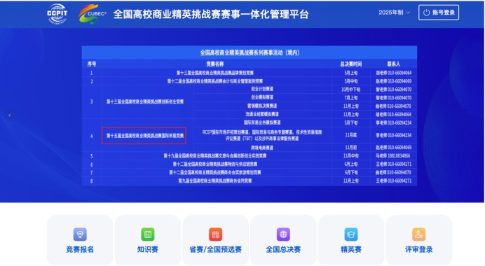 全球高校商业精英挑战赛国际贸易竞赛是由中国国际贸易促进委员会商业行业委员会牵头主办的学科竞赛活动。该竞赛纳入了高教学会学科竞赛排行榜,每年全国众多高校组织参加该项比赛,具有较大影响力。全球高校商业精英挑战赛国际贸易竞赛也是中央财经大学2025年度“一院一赛”立项项目,由学校教务处主办,国际经济与贸易学院承办,国贸学社协办。本次比赛围绕技术性贸易壁垒、标准国际化、贸易投资促进和参与全球经济治理等当前国际贸易领域的核心问题展开,与我校培养创新型、应用型和复合型国际经贸人才培养目标相契合,通过竞赛能够增进学生对国际经贸知识的理解,提高学生解决实际问题的能力。