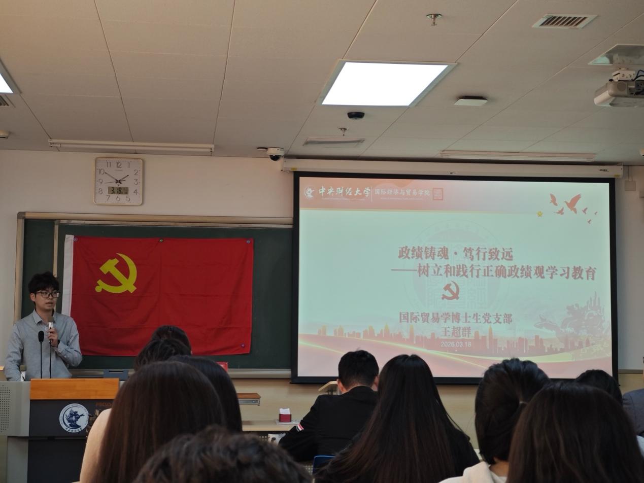 国际贸易学博士生党支部书记王超群围绕“树立和践行正确政绩观学习教育”作专题报告。王超群结合博士生党员成长实际,强调青年党员的政绩体现在学业、科研与报国志向中,要把论文写在祖国大地上。他从三个维度解读正确政绩观的丰富内涵,提醒党员警惕在思想认知、学习科研、思维格局等方面出现偏差,并结合身边榜样提出践行路径,引导支部党员坚守初心、担当作为,将个人发展融入国家对外开放大局。