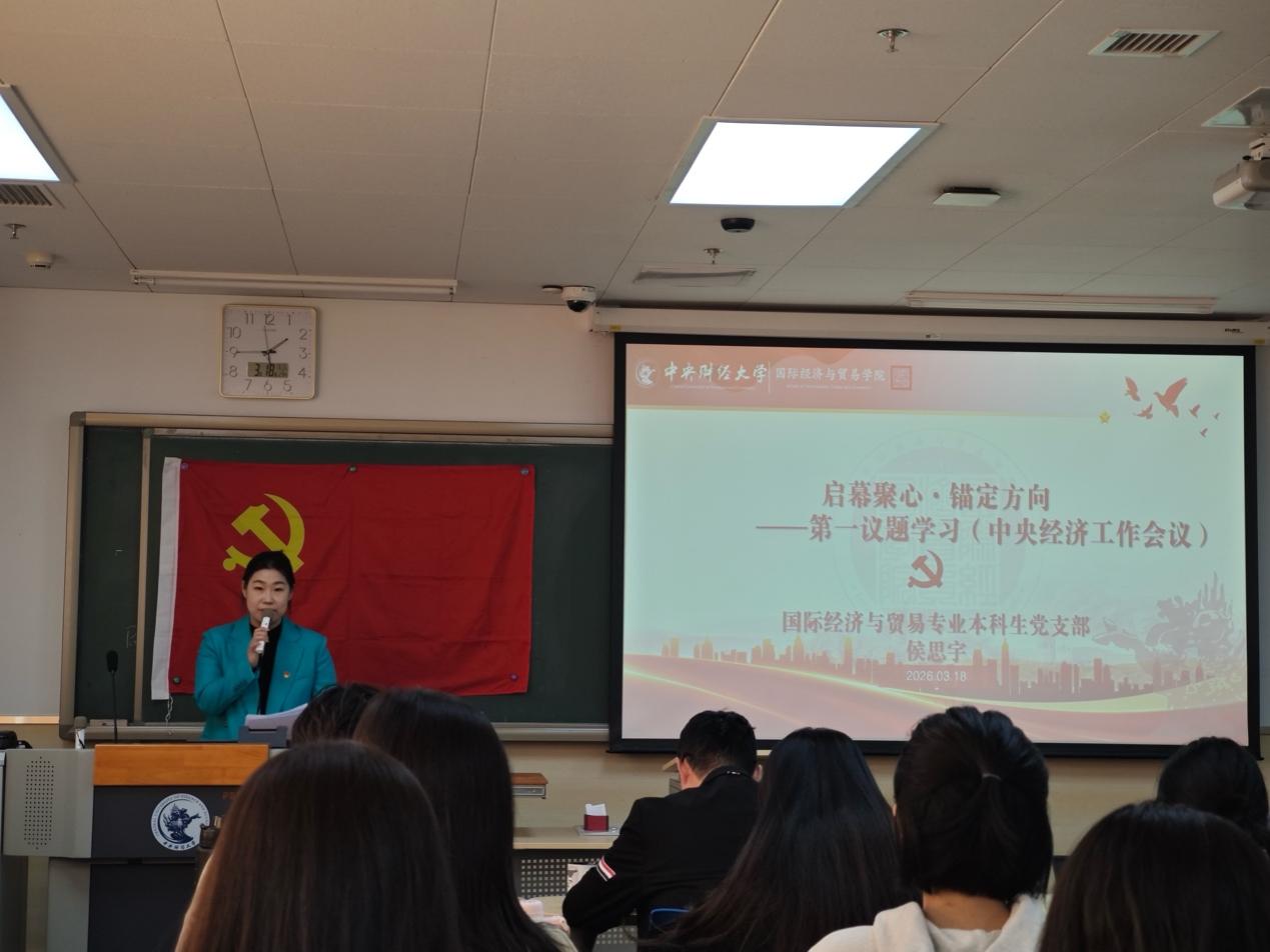 国际经济与贸易专业本科生党支部书记侯思宇老师领学在中央经济工作会议上习近平总书记重要讲话精神。侯老师紧扣树立和践行正确政绩观学习教育要求,引导支部党员深学细悟、对标笃行,切实把理论学习成果转化为传承弘扬雷锋精神、坚守为民造福初心的思想自觉,转化为立足专业成长、勇担时代使命的行动自觉,以实干担当践行青年党员的初心与责任。