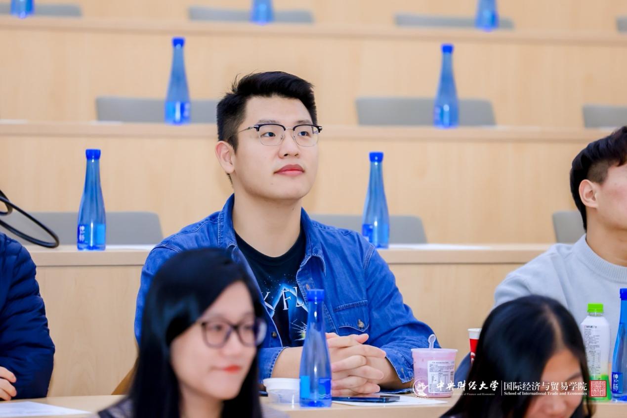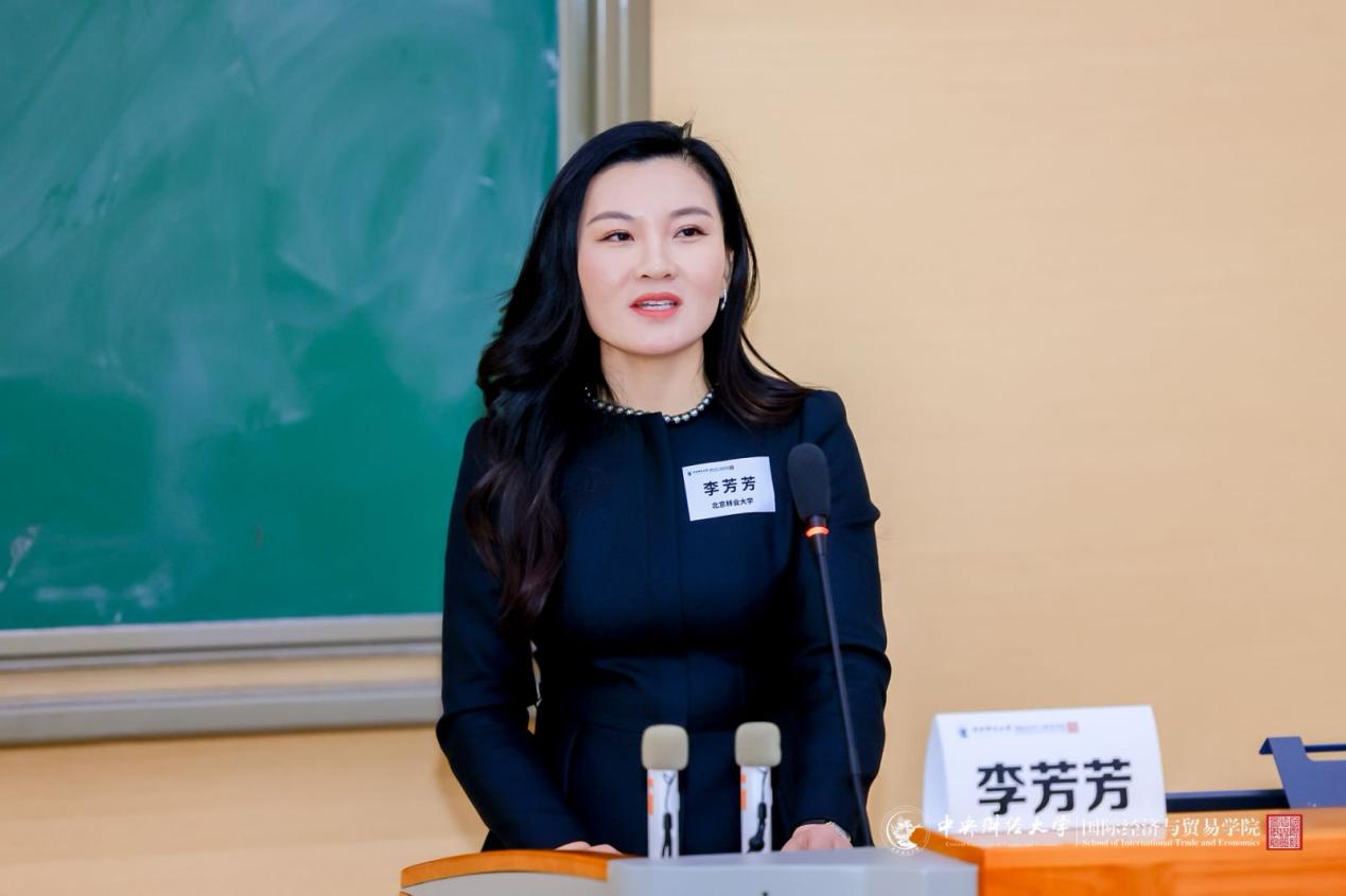 国际经济与贸易学院国际贸易学硕士2010级校友、北京林业大学经济管理学院国际贸易系教工党支部书记李芳芳致辞。李芳芳师姐以“信、韧、悟、光”四字回望成长:她坚信国贸专业“跨领域整合”的全球价值,着重强调学科自信;以坚韧经历学术路、校园路以及人生路;在实践中体悟科研之道,享受探索之乐;从导师张晓涛教授的支持中汲取照亮前路的“光”,追光而遇,沐光而行。她寄语学弟学妹把握高水平对外开放的时代机遇,在学院坚实的支撑下找准方向、踏实努力、不负韶华,收获星光。