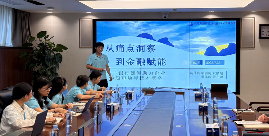 7月25日,实习实践团成员返回广西北部湾银行总部,分两组进行《从痛点洞察到金融赋能——银行如何助力企业跨越市场和技术壁垒》和《前沿产业赋能,特色金融领航——北部湾银行深耕地方经济的双轮驱动》主题汇报。