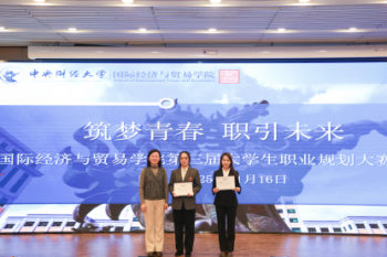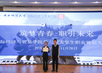 11月16日下午,学院于图书馆地下一层报告厅举办“筑梦青春 职引未来”——国际经济与贸易学院第三届大学生职业规划大赛决赛。本次大赛由中泰证券投行委债券与结构金融4部联席总经理杨旭山,2014级国际商务专业硕士校友、中国信保办公室宣传处/品牌管理处副处长李昂,中国农业银行股份有限公司北京万寿路支行综合管理部副经理石剑,校学生工作部、学生处、武装部副部(处)长欧萌,校人事处人事科科长刘潇钺担任评委,学院党委书记马国焘,中国农业银行股份有限公司北京万寿路铁道支行副行长霍冉以及学院各年级辅导员老师出席了此次比赛。本次大赛共计12位选手参赛,百名学生到场观摩。